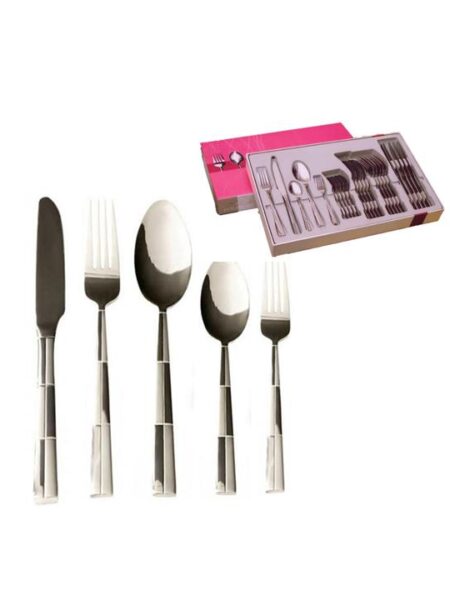Το σετ περιλαμβάνει:6 πιρούνια φαγητού, 6 μαχαίρια φαγητού, 6 κουτάλια φαγητού, 6 κουτάλια γλυκού, 6 πιρουνάκια γλυκού.