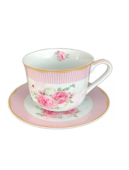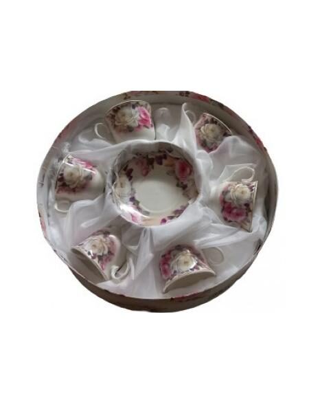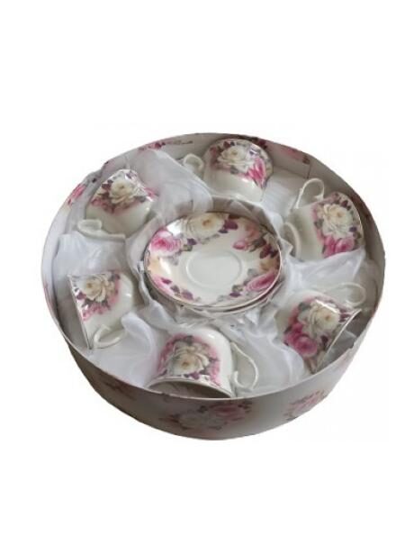 Σετ τσαγιού 6τμχ πορσελάνης από 6 φλιτζάνια και 6 πιάτα Vintage Roses, σε καπελιέρα με υφασμάτινη εσωτερική επένδυση.