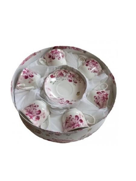 Σετ του καφέ 6τμχ πορσελάνης από 6 φλιτζάνια και 6 πιάτα Vintage Flowers, σε καπελιέρα με υφασμάτινη εσωτερική επένδυση.