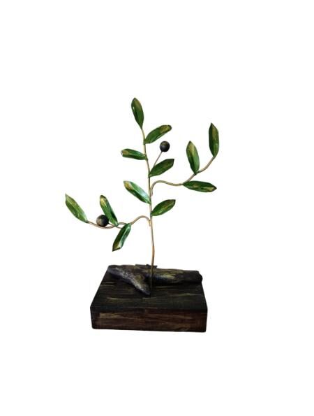 Χειροποίητο ορειχάλκινο κλαδί ελιάς με φύλλα καλυμένα με σμάλτο και καρπούς, τοποθετημένο σε ξύλινη βάση με κορμό ξύλου.