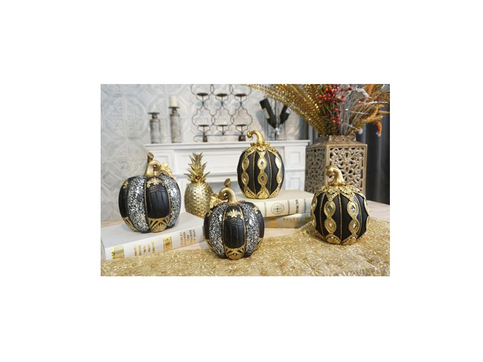 Διακοσμητική Πολυεστερική Κολοκύθα Μαύρη – Χρυσή -Ασημί. 16x16x21εκ.