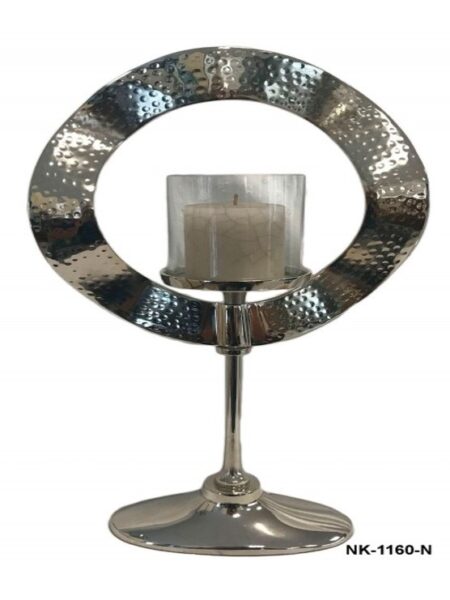 Κηροπήγιο διακοσμητικό μεταλλικό σε βάση σφυρήλατο, σε ασημί χρωματισμό και γυάλινη προστατευτική θήκη για κερί.