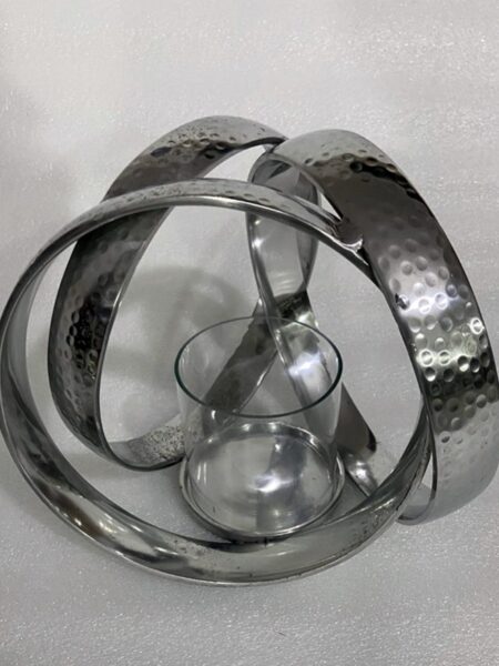 Ειδυλλιακό περιβάλλον με κομψό και εντυπωσιακό μεταλλικό ασημί διακοσμητικό κηροπήγιο.