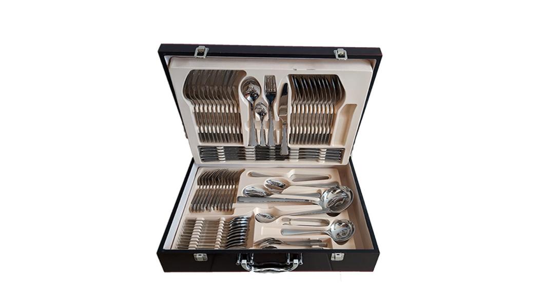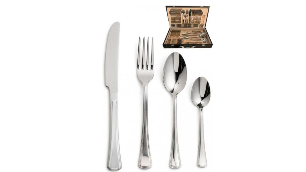 Μαχαιροπίρουνα από ανοξείδωτο ατσάλι 18/10 διατίθενται σε βαλίτσα των 72 τεμαχίων. Τα μαχαιροπίρουνα έχουν μεγάλη αντοχή, δεν φθείρονται εύκολα και είναι ανθεκτικά στο πλυντήριο πιάτων.