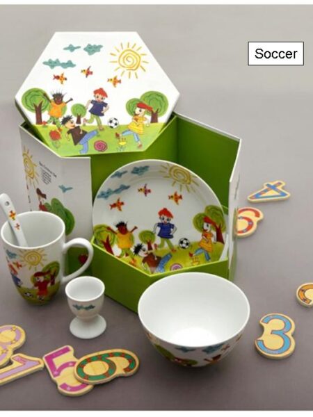 Παιδικό σετ 5 τεμαχίων από πορσελάνη, σχέδιο Soccer, αποτελείται: από ένα μπολ, ένα πιάτο ρηχό, μία κούπα, μία αυγοθήκη και ένα κουταλάκι.