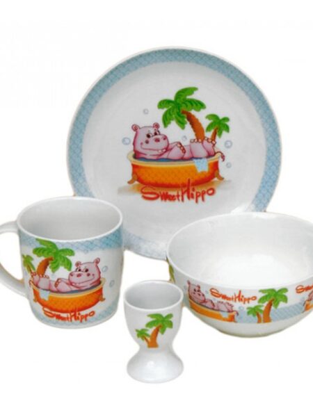 Παιδικό σετ φαγητού ΙΠΠΟΠΟΤΑΜΟΣ (SWEET HIPPO), 4 τεμαχίων από φίνα πορσελάνη. Το σετ αποτελείται από μια κούπα, ένα μπολ πολλαπλών χρήσεων, ένα πιάτο και μία αυγοθήκη.