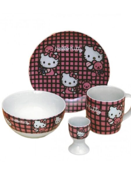 Παιδικό σετ φαγητού HELLO KITTY, 4 τεμαχίων από φίνα πορσελάνη. Το σετ αποτελείται από μια κούπα, ένα μπολ πολλαπλών χρήσεων, ένα πιάτο και μία αυγοθήκη.