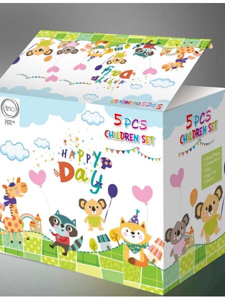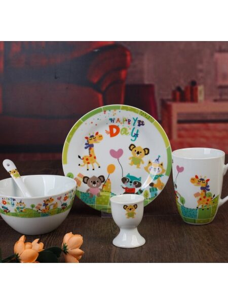 Παιδικό σετ 5 τεμαχίων από πορσελάνη, σχέδιο HAPPY DAY, αποτελείται: από ένα μπολ, ένα πιάτο ρηχό, μία κούπα, μία αυγοθήκη και ένα κουταλάκι.