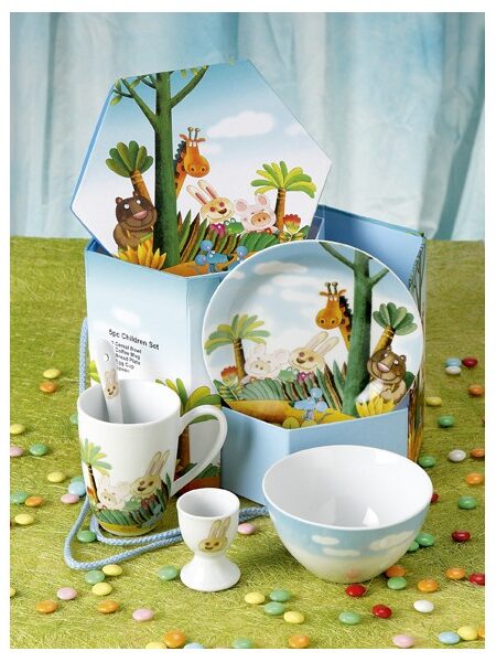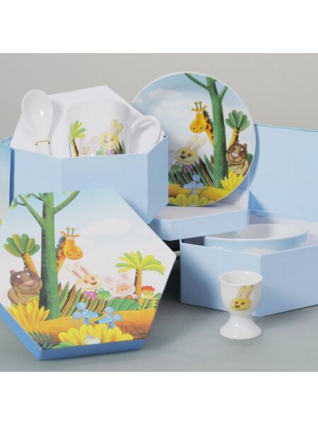 Παιδικό σετ 5 τεμαχίων από πορσελάνη, σχέδιο ZOO, αποτελείται: από ένα μπολ, ένα πιάτο ρηχό, μία κούπα, μία αυγοθήκη και ένα κουταλάκι.