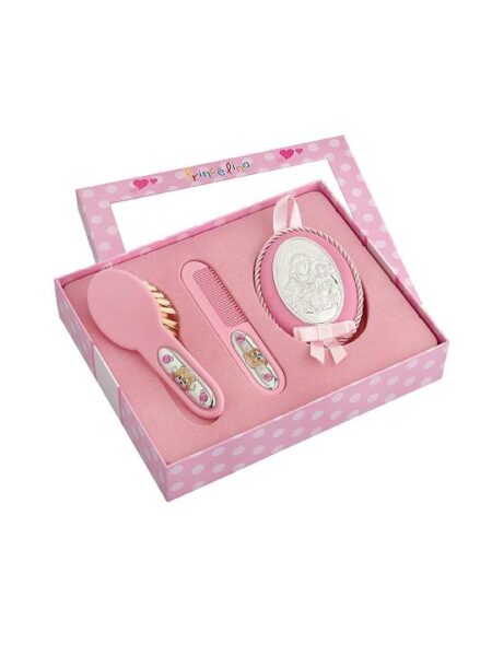 Σε κουτί δώρου, εικονάκι φυλακτό ΠΑΝΑΓΙΑ, χτενάκι και βούρτσα διακοσμημένα με ασημένια μοτίφ.
