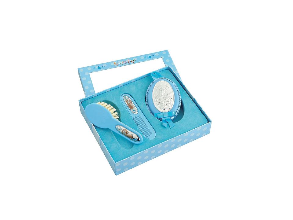 Σε κουτί δώρου, εικονάκι φυλακτό ΠΑΝΑΓΙΑ, χτενάκι και βούρτσα διακοσμημένα με ασημένια μοτίφ.