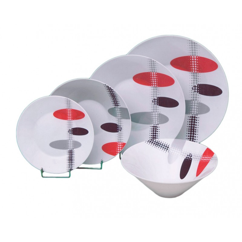 Το σετ περιλαμβάνει 6 πιάτα φαγητού ρηχά, 6 πιάτα φαγητού βαθιά, 6 πιάτα φρούτου, 1 πιατέλα και 1 σαλατιέρα.