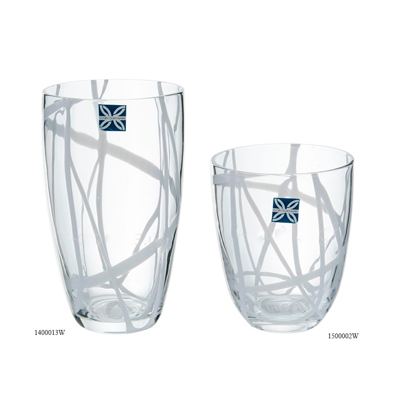 6 ποτήρια σωλήνα νερού και 6 ποτήρια ουίσκι χειροποίητα από φυσητό γυαλί διακοσμημένα με λευκή ρίγα.