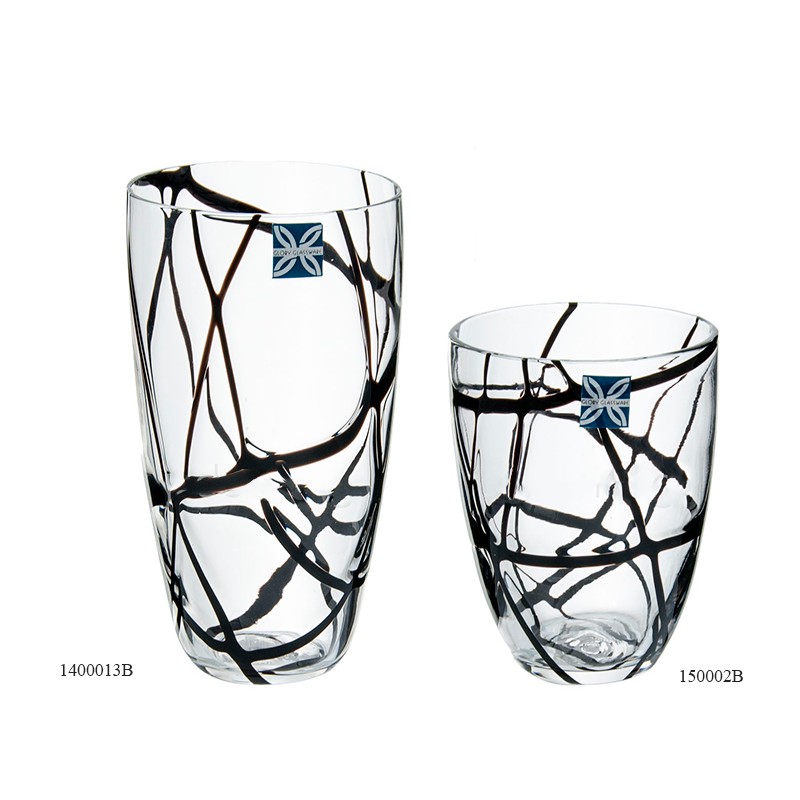 Ποτήρια σωλήνα νερού και ποτήρια ουίσκι χειροποίητα από φυσητό γυαλί διακοσμημένα με μαύρη ρίγα.