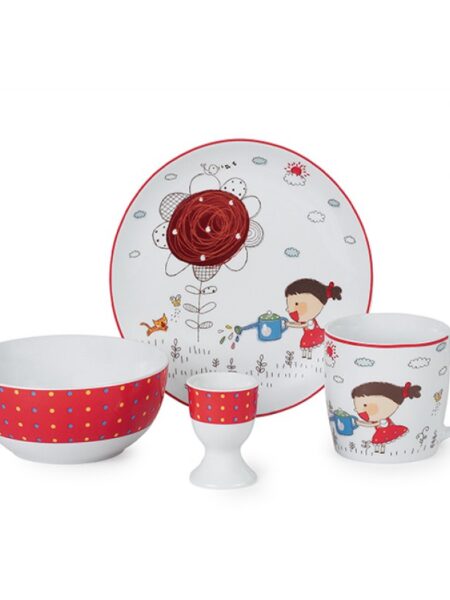Παιδικό σετ φαγητού ΠΑΙΔΑΚΙΑ, 4 τεμαχίων από φίνα πορσελάνη. Το σετ αποτελείται από μια κούπα, ένα μπολ πολλαπλών χρήσεων, ένα πιάτο και μία αυγοθήκη.