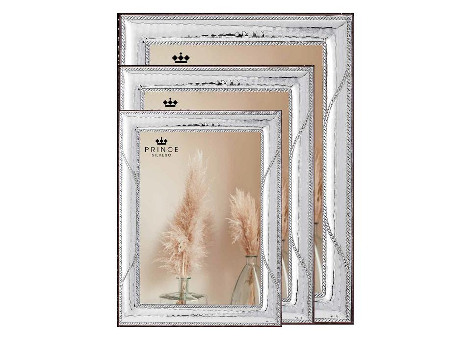 Ασημένιες κορνίζες με ξύλινη λουστραρισμένη πλάτη και διπλό σιρίτι. Σετ 3 τεμάχια 9χ13εκ, 13χ18εκ, 18χ24εκ.