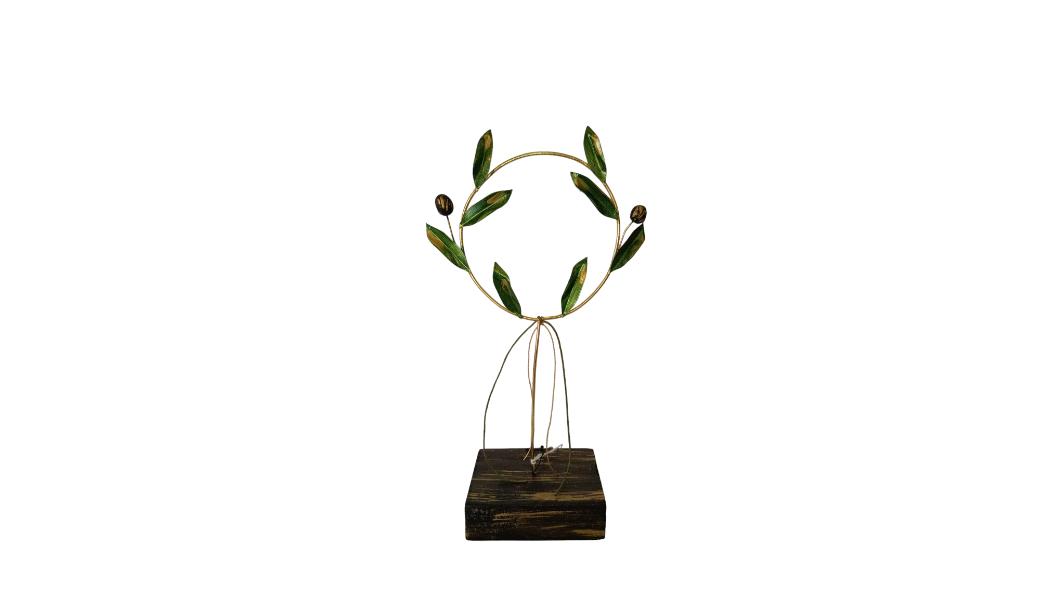 Χειροποίητο ορειχάλκινο στεφάνι ελιάς με φύλλα καλυμένα με σμάλτο και καρπούς, τοποθετημένο σε ξύλινη βάση.