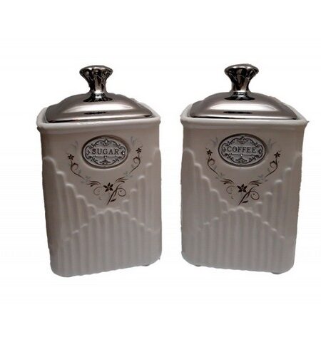 Σετ 2 τεμαχίων κεραμικά βάζα για καφέ και ζάχαρη, με επιμεταλωμένο καπάκι, διακοσμημένα.