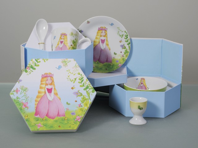 It consists of: a bowl, a shallow plate, a mug, an egg cup and a spoon.,In a luxurious impressive gift box