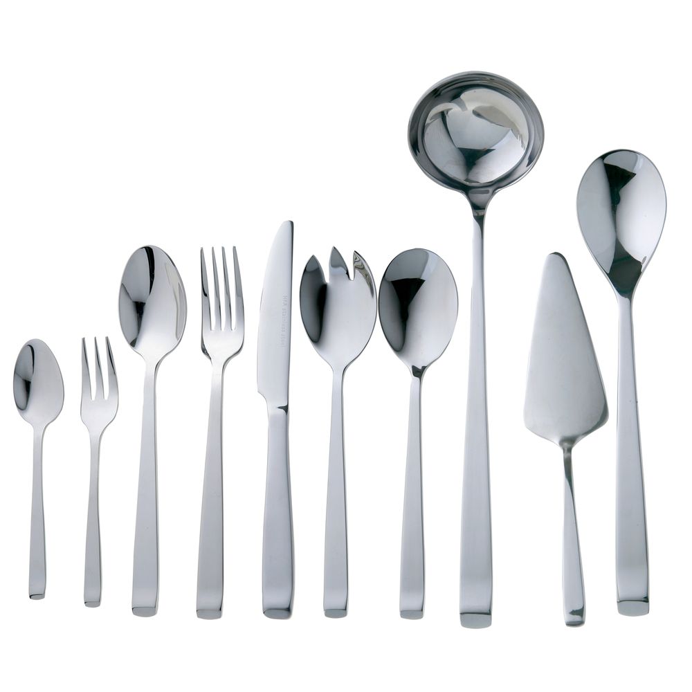 The set includes: 12 food knives, 12 food spoons, 12 food forks, 12 dessert spoons, 12 dessert forks, 1 soup ladles, 1 spatula, 1 salad fork, 1 salad ladle, 1 serving ladle. In gift packaging. Safe for the dishwasher. TSAK